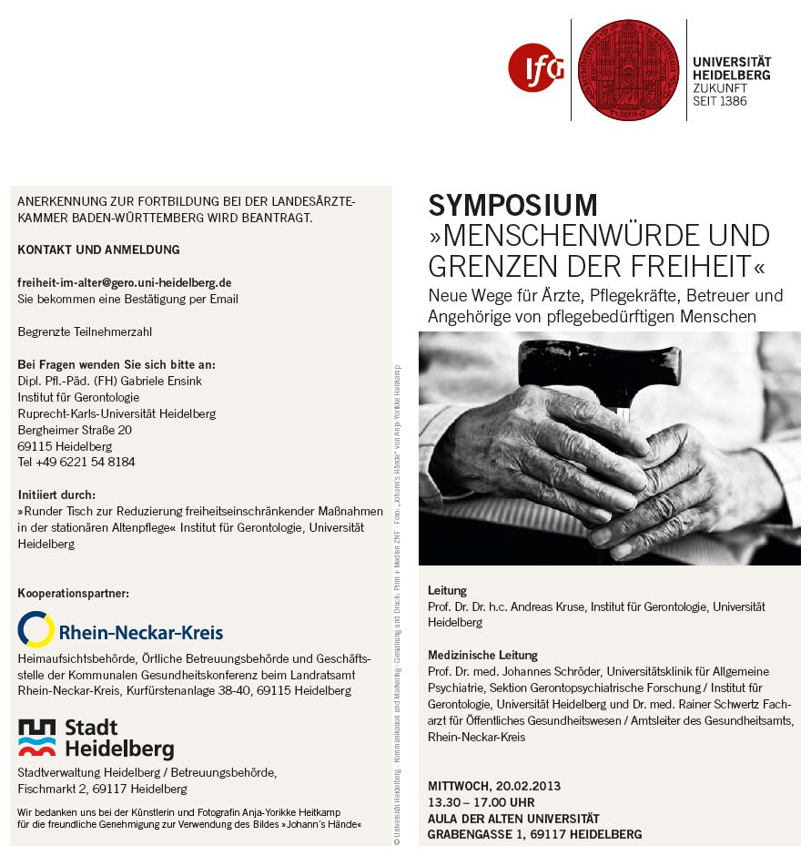 Der „Runde Tisch zur Reduzierung freiheitsentziehender Maßnahmen in der stationären Altenpflege“ am Institut für Gerontologie der Universität Heidelberg lädt hierzu gemeinsam mit der Heimaufsichtsbehörde, der Örtlichen Betreuungsbehörde und Geschäftsstelle der Kommunalen Gesundheitskonferenz des Rhein-Neckar-Kreises sowie der Betreuungsbehörde der Stadt Heidelberg zum Symposium „Menschenwürde und Grenzen der Freiheit“ ein. Die Veranstaltung unter der Leitung von Prof. Dr. Dr. h.c. Andreas Kruse vom Institut für Gerontologie der Universität Heidelberg findet am 20. Februar 2013 von 13:30 bis 17 Uhr in der Aula der Alten Universität, Grabengasse 1, 69117 Heidelberg, statt..