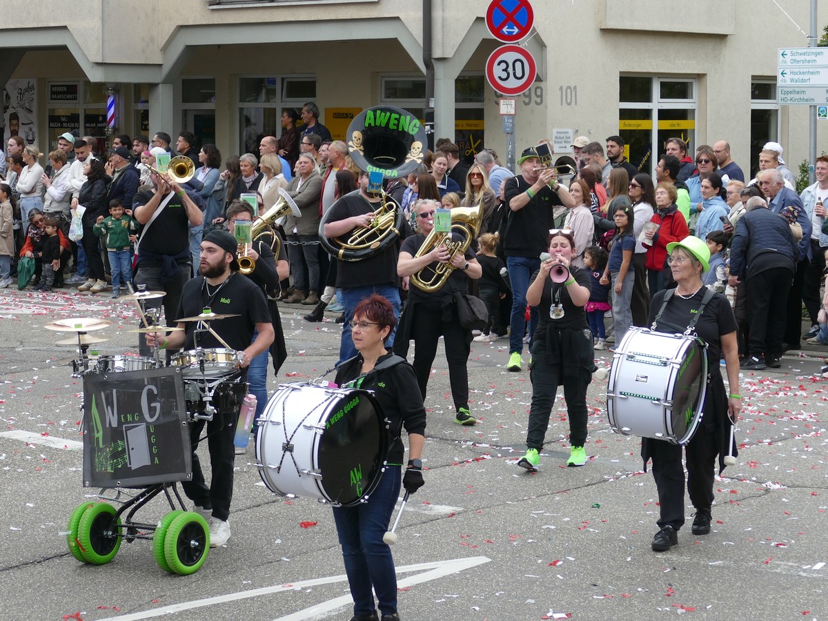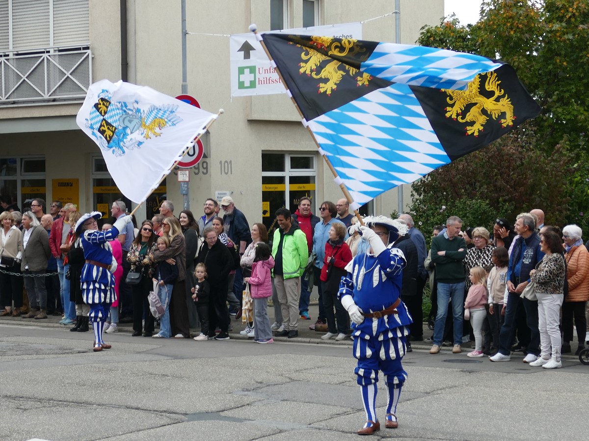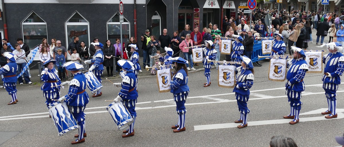 Traditionell auf die Pauke gehauen hat der Kurpfälzer Fanfarenzug Wiesloch – ganz in Blau-Weiß und stilecht im Landsknecht-Outfit. Die Trommeln dröhnten, die Fanfaren klangen, und der Takt war so präzise, dass sogar die Bordsteinkanten mitwippten.
