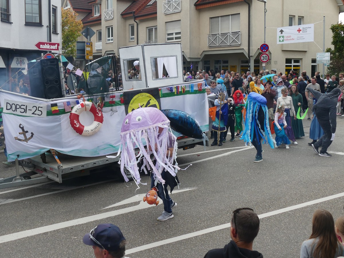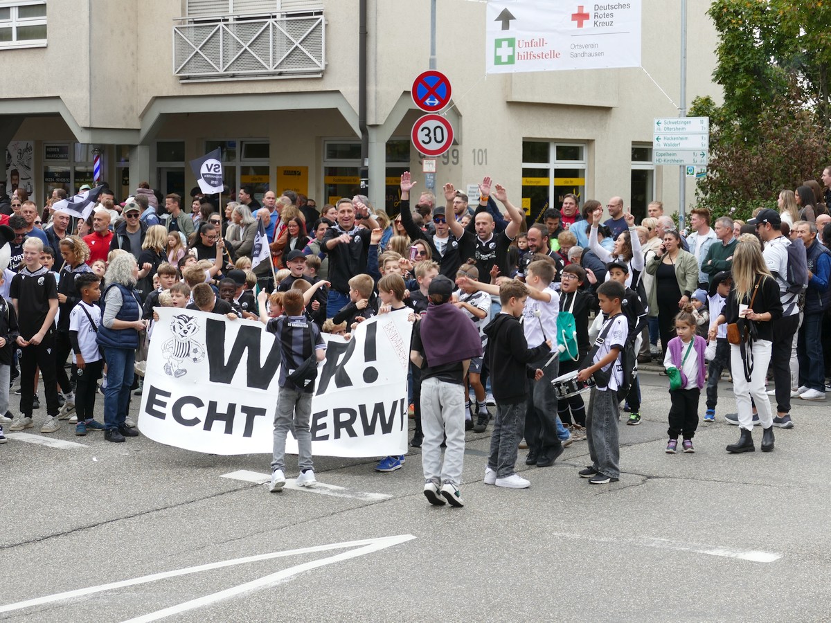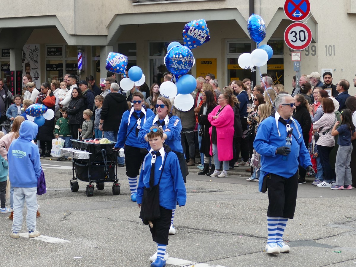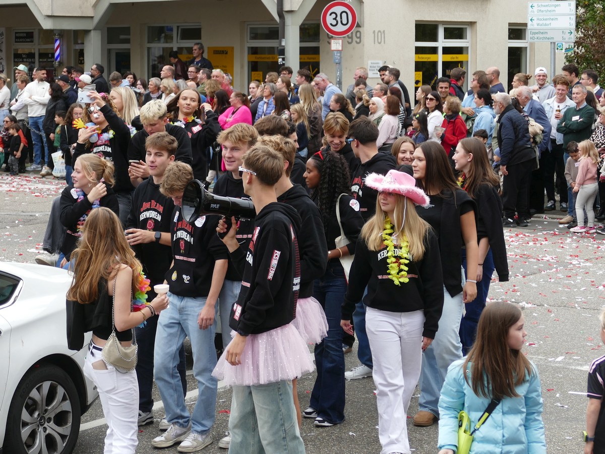 (atz – 12.10.25)  Besser hätte man es kaum inszenieren können: Am vergangenen Samstag verwandelte sich ganz Sandhausen ab 14 Uhr in eine farbenfrohe Festmeile – einmal quer durch den Ort zog der große Kerweumzug, bejubelt von tausenden Menschen, die am Straßenrand dicht gedrängt Spalier standen. 25 Gruppen, Vereine, Kindergärten und kreative Einzelkämpfer hatten sich in Schale geworfen, um der Kerwe eine ausgelassene Bühne zu bieten – und was für eine!