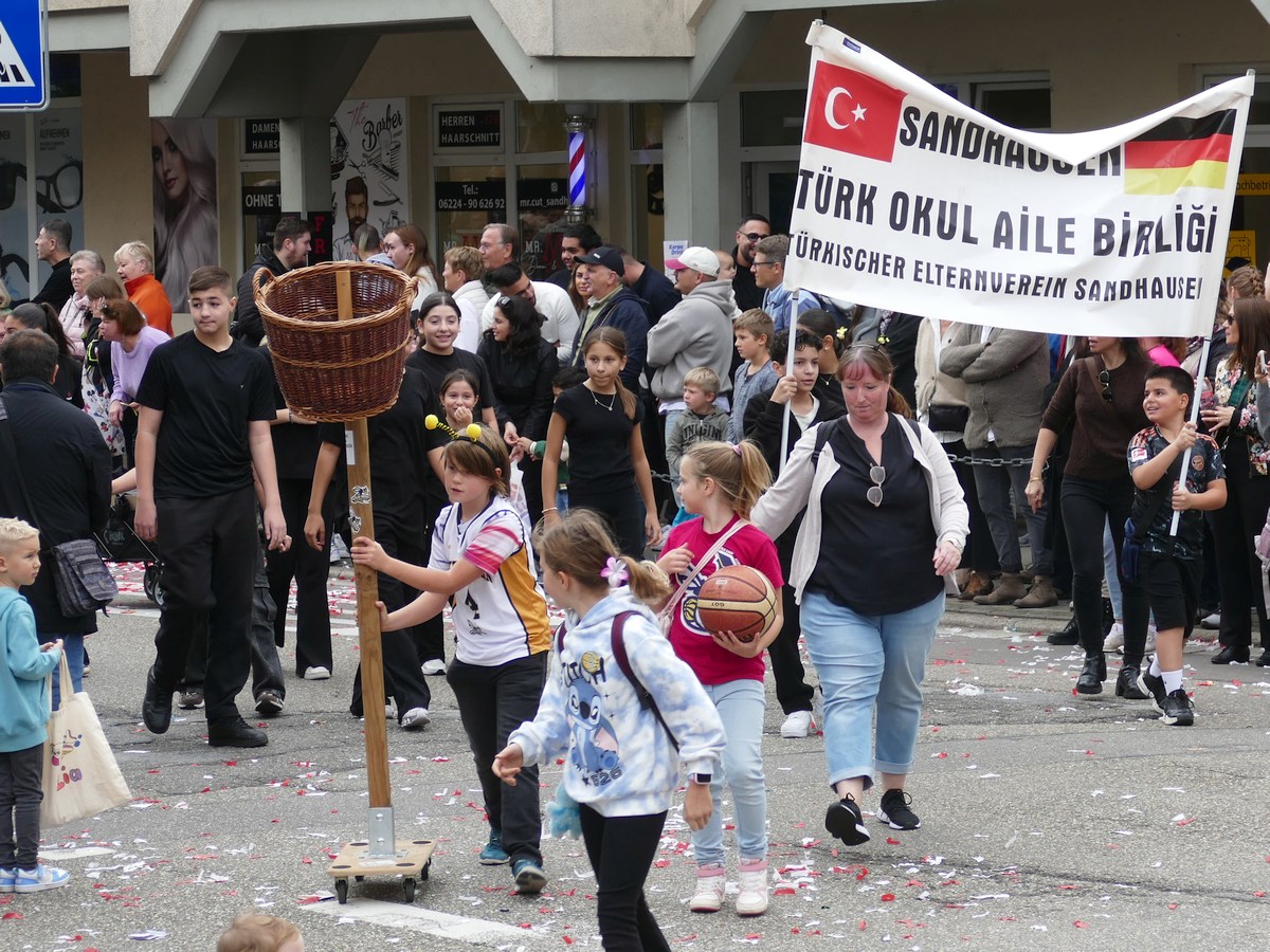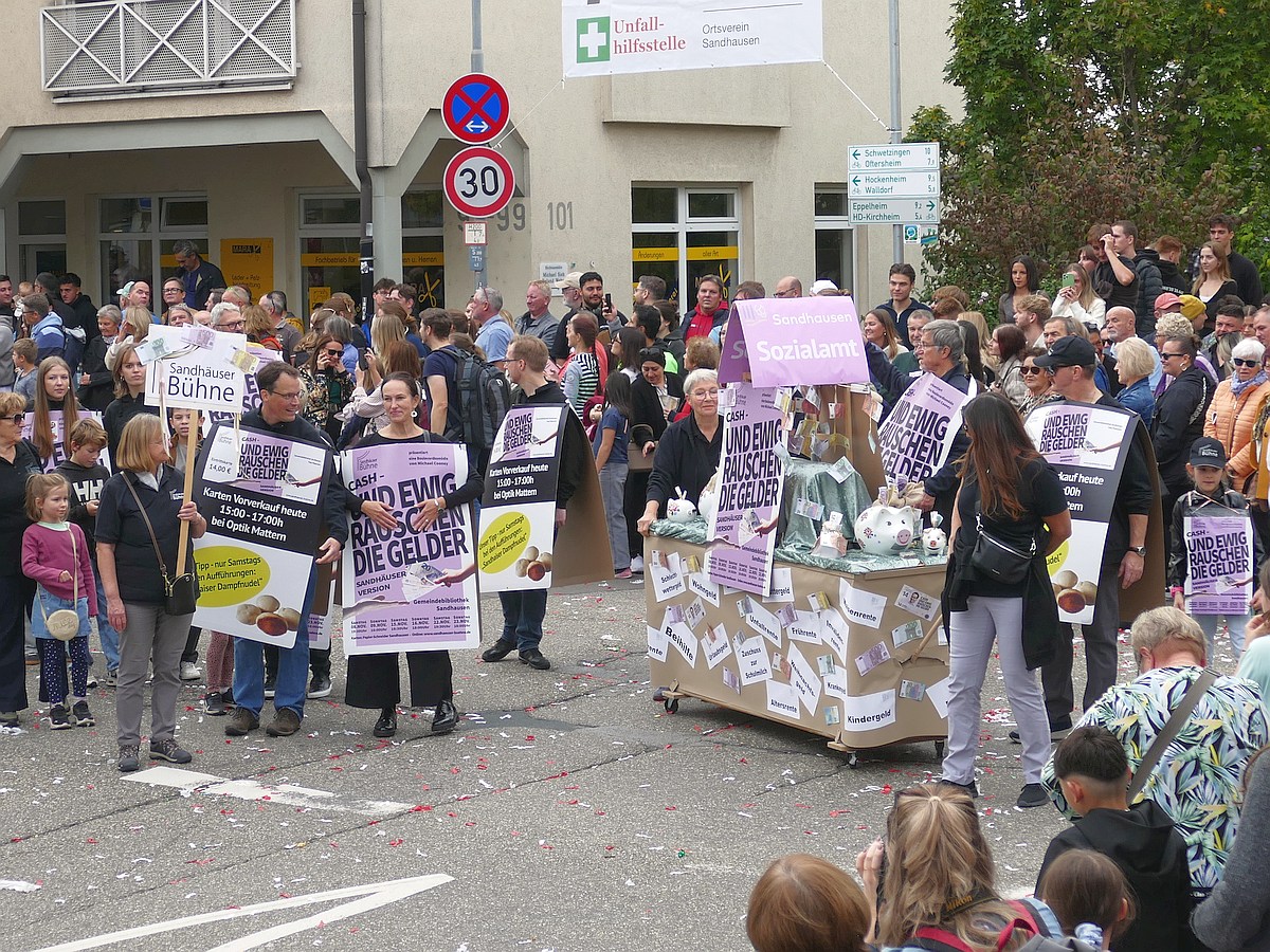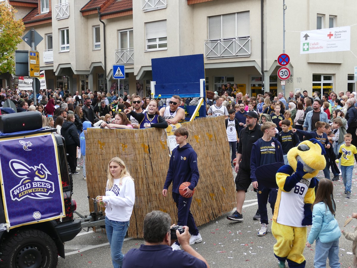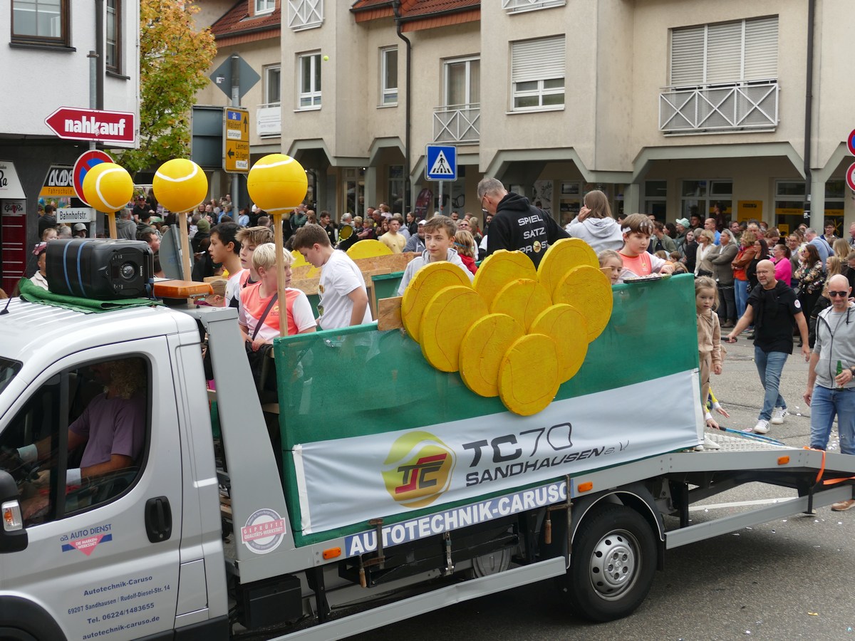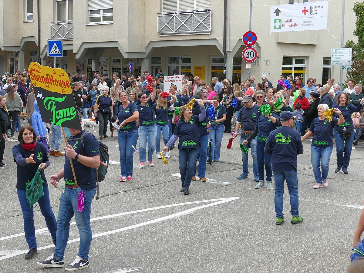 (atz – 12.10.25)  Besser hätte man es kaum inszenieren können: Am vergangenen Samstag verwandelte sich ganz Sandhausen ab 14 Uhr in eine farbenfrohe Festmeile – einmal quer durch den Ort zog der große Kerweumzug, bejubelt von tausenden Menschen, die am Straßenrand dicht gedrängt Spalier standen. 25 Gruppen, Vereine, Kindergärten und kreative Einzelkämpfer hatten sich in Schale geworfen, um der Kerwe eine ausgelassene Bühne zu bieten – und was für eine!