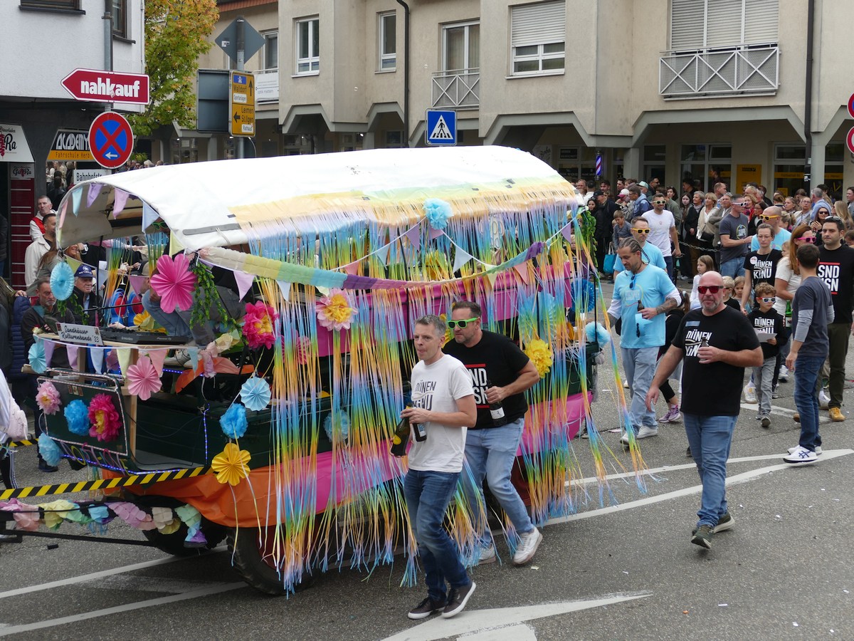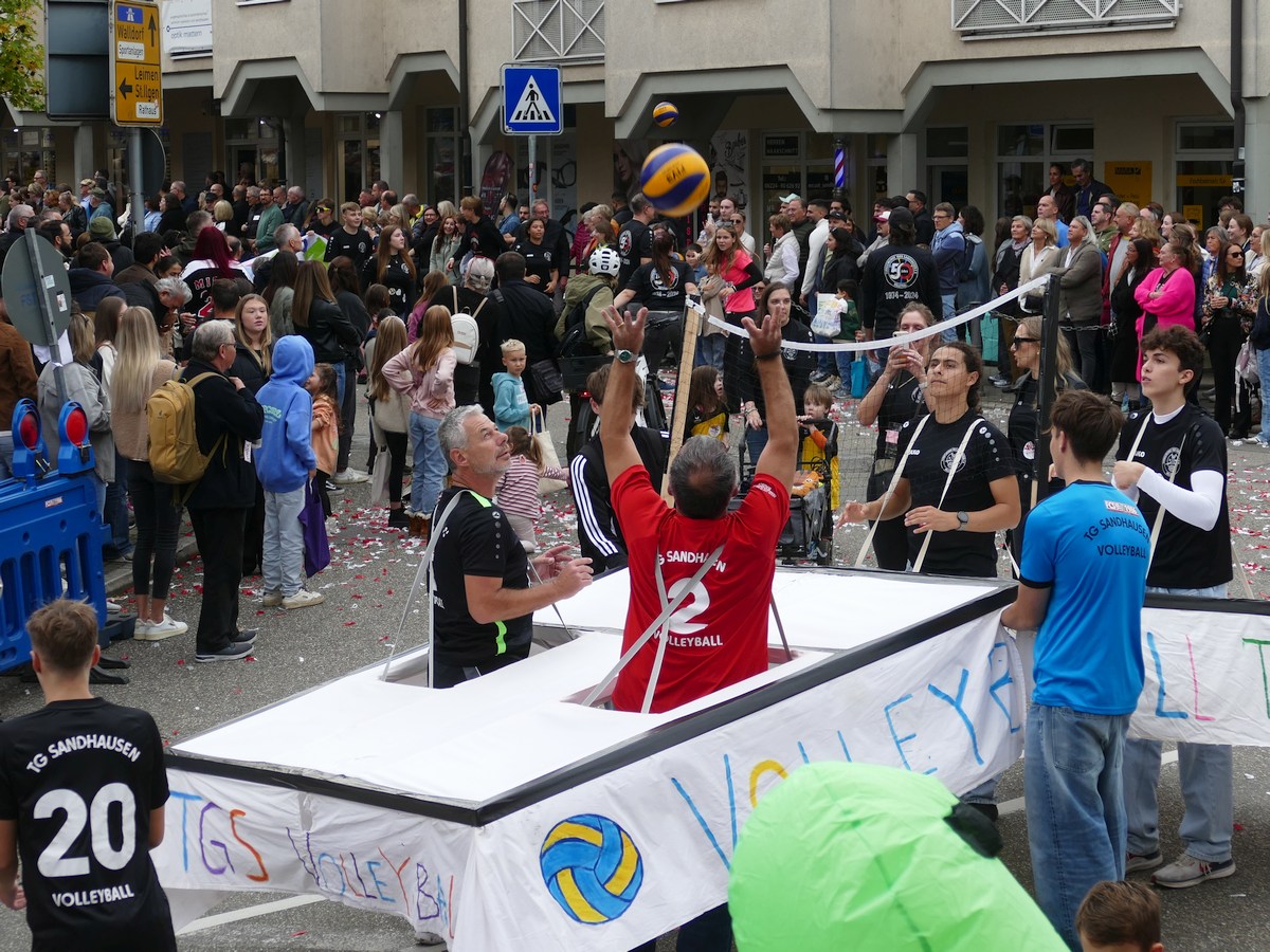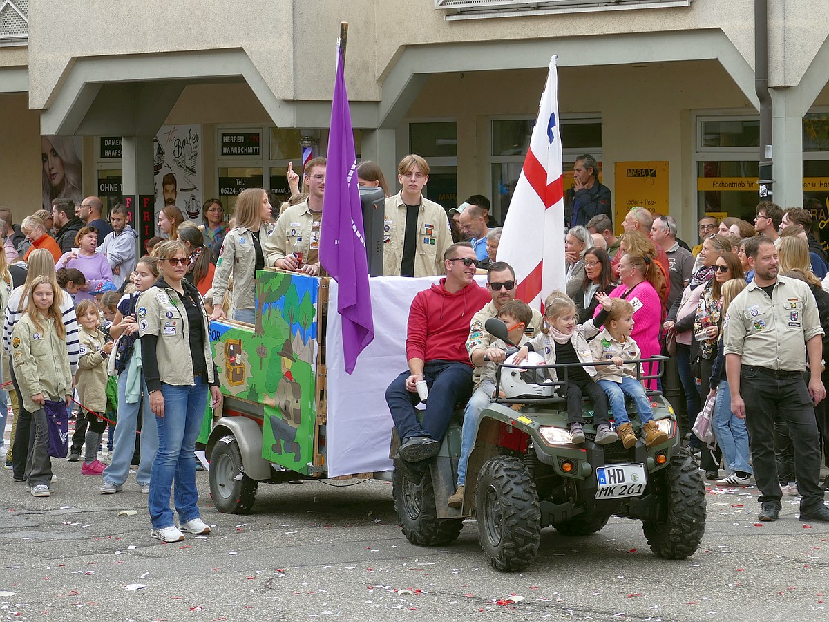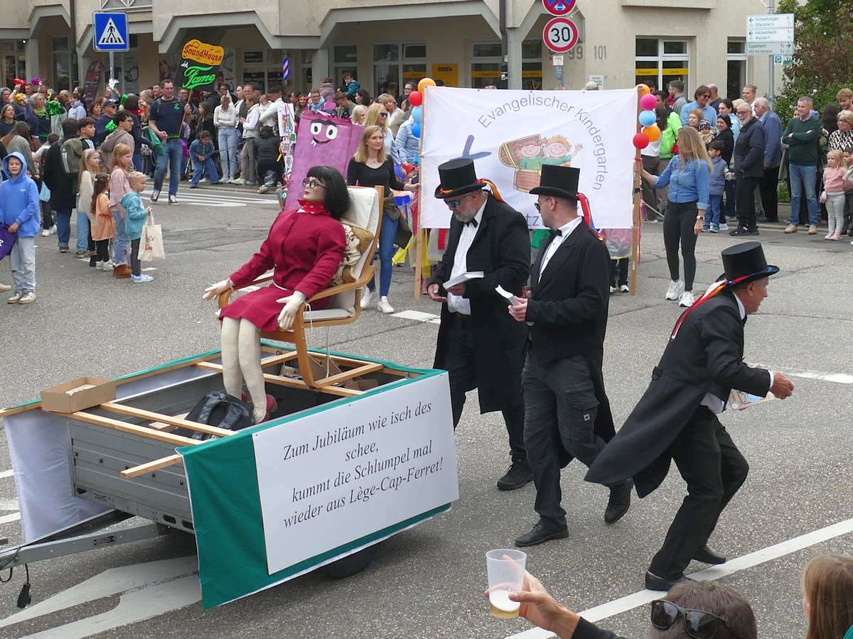 (atz – 12.10.25)  Besser hätte man es kaum inszenieren können: Am vergangenen Samstag verwandelte sich ganz Sandhausen ab 14 Uhr in eine farbenfrohe Festmeile – einmal quer durch den Ort zog der große Kerweumzug, bejubelt von tausenden Menschen, die am Straßenrand dicht gedrängt Spalier standen. 25 Gruppen, Vereine, Kindergärten und kreative Einzelkämpfer hatten sich in Schale geworfen, um der Kerwe eine ausgelassene Bühne zu bieten – und was für eine!