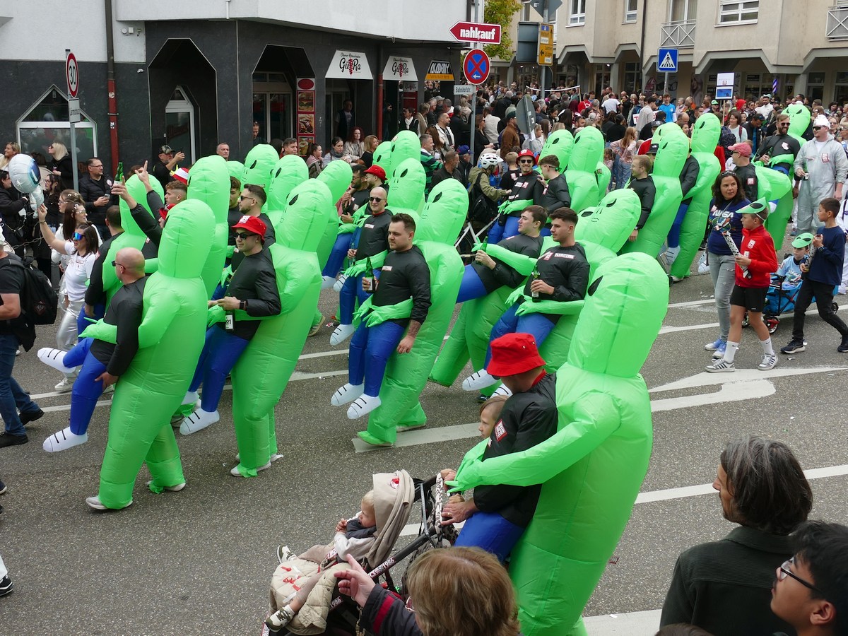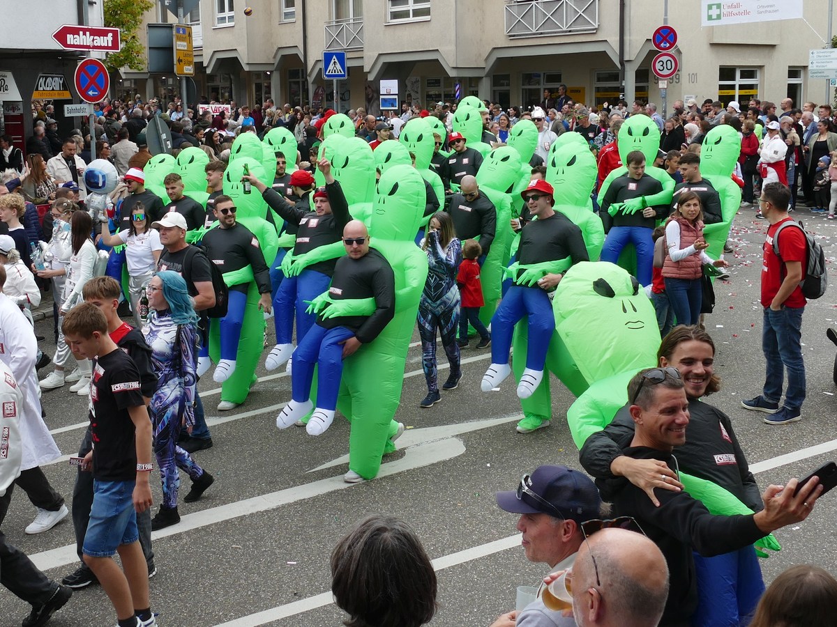 Besonders außerirdisch wurde es mit der Gruppe des FCS in futuristischen Raumanzügen, angeführt von der FcSpaceX-Rakete. Zwischen glänzendem Silber, riesigen Gummi-Aliens und Sonnenbrillen mit Glitzerperücken schwebte der gute Geschmack irgendwo zwischen NASA und Kindergeburtstag – aber das war genau richtig so.