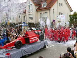Vollgas und Konfetti hieß es beim Auftritt der „Scuderia Bernstein“. In rotem Overall, Champagnerflasche in der Hand und mit einem selbstgebauten Boliden im Ferrari-Look, zog das Team alle Blicke auf sich. Ein Konfettiregen sondergleichen krönte den Boxenstopp vor dem Rathaus – da wäre selbst Monte Carlo neidisch geworden.