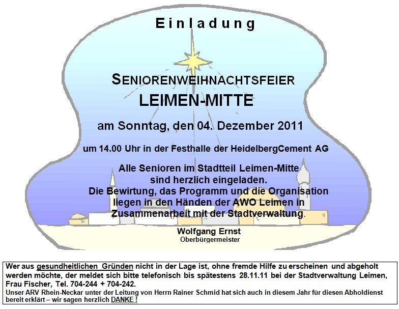 Am 4. Dezember findet in der Festhalle der HeidelberCement AG die Seniorenweihnachtsfeier der Stadt Leimen statt. Die Bewirtung und das Programm wird durch die AWO Leimen durchgeführt.