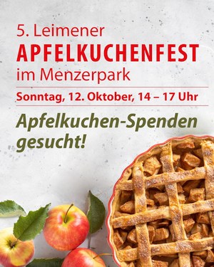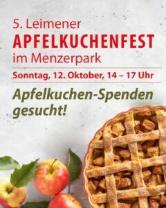 Am 12. Oktober von 14 – 17 Uhr lädt Leimen Legt Los alle Leimener in den Menzerpark ein, um wieder gemeinsam das Apfelkuchenfest zu feiern. In den letzten Jahren ist unser Fest zu einem kleinen Volksfest geworden, bei dem die Besucher:innen leckeren Apfelkuchen und fröhliche Gesellschaft genießen konnten. Die Vorbereitungen für dieses Jahr laufen schon und wir sind sicher, dass es wieder eine schöne Veranstaltung wird.