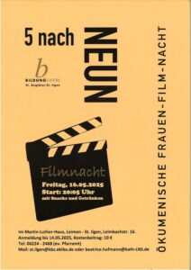 16. Mai 2025, um 20:05 Uhr die Tür zu einem besonderen Abend für Frauen: Die evangelische und katholische Kirchengemeinde St. Ilgen laden zur ökumenischen Frauen-Filmnacht ins Martin-Luther-Haus ein.