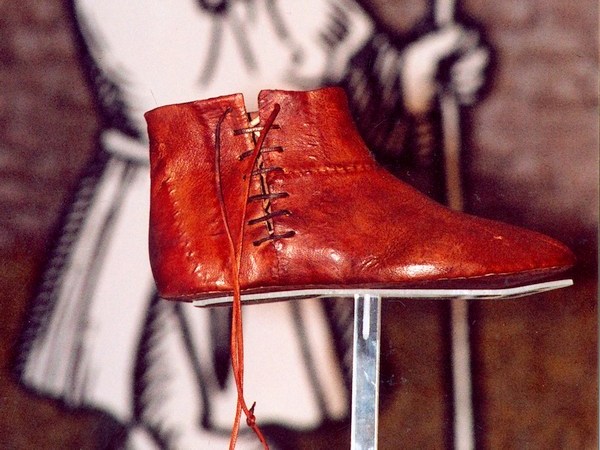 Replik eines historischen Bundschuhs vor einer Darstellung von Joß Fritz. Gezeigt in der Ausstellung „Das verborgene Feuer“, Bruchsal 2002.