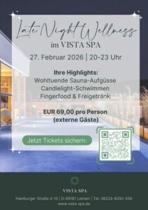 (fwu – 24.2.26) Leimen bekommt einen Abend für Ruhesuchende. Am 27. Februar öffnet das VISTA SPA der Villa Toskana von 20 bis 23 Uhr exklusiv zum „Late Night Wellness“.