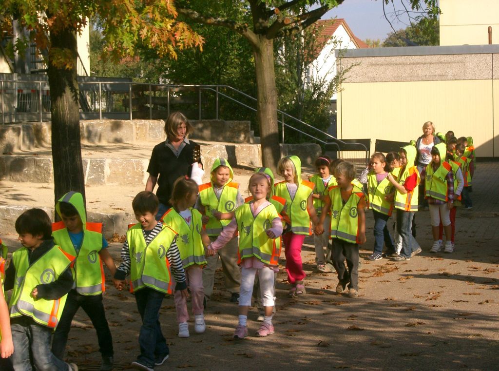 Frau Stöckermann-Borst, Rektorin der Geschwister-Scholl-Schule, begrüßte bei strahlendem Sonnenschein die Kinder und anwesenden Vertreter des MSC St.Ilgen auf der neu gestalteten Sitzarena im Schulhof. Mit einem Lied über den Straßenverkehr auf dem Schulweg haben die Schulanfänger der Geschwister-Scholl-Schule St.Ilgen stolz ihre neuen ADAC Sicherheitswesten präsentiert.