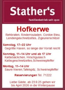 (fwu – 26.9.25) Mit dem traditionellen Kerwemontag ging in Leimen eine Epoche zu Ende: Nach 95 Jahren stellte der Familienbetrieb Stather seine regelmäßige Bewirtung ein. Was einst als Schlachterei begann und sich über Jahrzehnte zu einem beliebten Gasthaus mit angeschlossenem Biergarten wandelte, firmierte zuletzt unter dem Namen Stather’s – ein Ort, der für viele, insbesondere bei alteingesessenen Leimenern ein Inbegriff robust-herzlicher Gastlichkeit und klassischer deutscher Küche war.