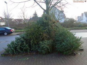 Unsere Appelle an die Menschen, die ihre Bäume so zu Lasten der Allgemeinheit in den öffentlichen Raum entsorgen, werden wohl kaum etwas nützen. Möglicherweise hilft aber ein Hinweis unter Nachbarn. Wegräumen oder sich als bekennende/r Asoziale/r outen. Das ist die Alternative. Wenn auch das nicht hilft, wird man wohl damit leben müssen, unter Asozialen zu leben. Insoweit ist es also ein Problem aller Anwohner und Nachbarn der ausgesetzten Tannenbäume.