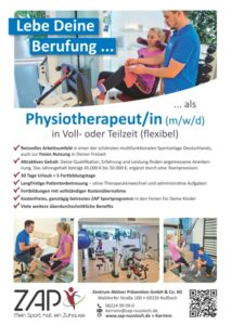 Das Zentrum sucht zudem Physiotherapeutinnen und Physiotherapeuten in Voll- oder Teilzeit. Das Gehalt reicht von rund 3 000 Euro für Einsteiger bis 4 000 Euro für Fachkräfte mit Manualtherapie, KGG und Lymphdrainage bei einer 40-Stunden-Woche. Hinzu kommen Sachwertgutscheine, ein BAV-Programm, Teamprovisionen sowie freie Anlagen- und Kinderbetreuung während der Sportferien. Bewerbungen gehen an [email protected].