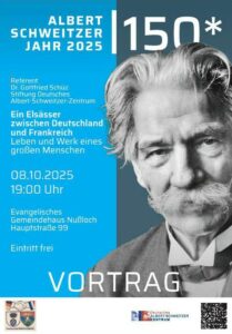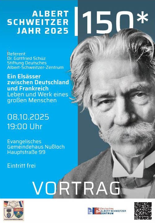 Der Partnerschaftsverein „Freundeskreis Nußloch-Andernos e.V.“ lädt ein zu einer besonderen Veranstaltung im Albert Schweitzer Jahr 2025. Der 150. Geburtstag und der 60. Todestag des evangelischen Theologen, Philosophen, Musikers, Arztes und Friedensnobelpreisträgers Dr. Albert Schweitzer ist Anlass, sich speziell mit dem Humanisten und Menschenfreund zu befassen.