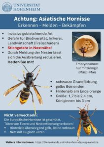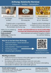 Weitere Informationen zur Asiatischen Hornisse und wie sich die Art von heimischen Insekten unterscheiden lässt, finden sich auf der Homepage der LUBW sowie mit weiteren Details zu Nestern und der Nestentfernung auf der Homepage der Landesanstalt für Bienenkunde der Universität Hohenheim.