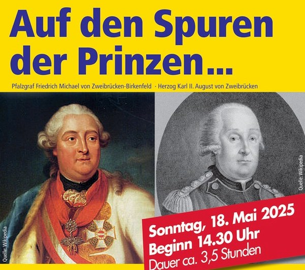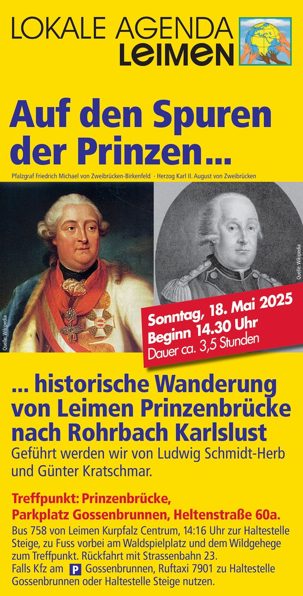 (geg – 2.5.25) Wer am 18. Mai 2025 gegen halb drei nachmittags an der Prinzenbrücke in Leimen steht, begibt sich auf eine Zeitreise – und zwar nicht irgendeine. Unter dem Titel „Auf den Spuren der Prinzen“ lädt die Lokale Agenda Leimen zu einer historischen Wanderung ein, die von der Prinzenbrücke über geschichtsträchtige Pfade bis nach Rohrbach-Karlslust führt. Gut 3,5 Stunden darf man sich auf die Spuren zweier illusterer Gestalten aus der pfälzischen Vergangenheit begeben: Pfalzgraf Friedrich Michael von Zweibrücken-Birkenfeld und Herzog Karl II. August von Zweibrücken.