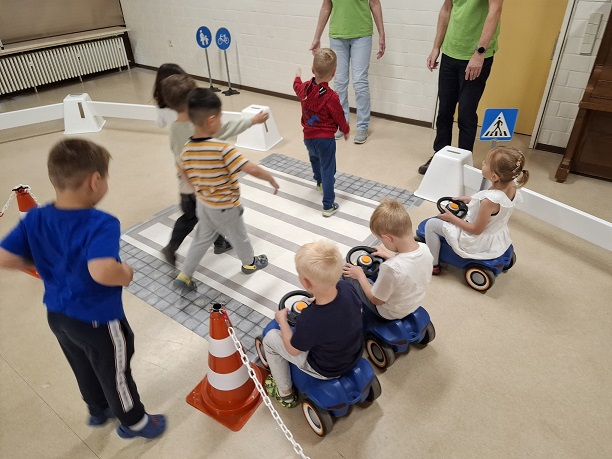 Dann folgte das große Einteilen: Autofahrer auf die Bobby Cars, Fußgänger an den Straßenrand. Beim Überqueren des Zebrastreifens wurde gestoppt, gewartet, gewunken – fast wie auf einer echten Kreuzung an einem Freitagnachmittag. Nur dass hier niemand hupte, sondern lachte. Der Spaß kam jedenfalls nicht zu kurz – und das Lernen auch nicht.