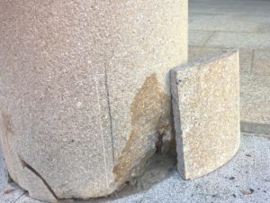 Begonnen wurde jetzt zunächst mit der Sanierung der Säulen über dem Haupteingang. Diese zeigen Risse und werden zunächst mit einem Opferputz behandelt, der das Salz aus dem Beton im unteren Bereich herausziehen soll. Dann werden die Säulen nach unten abgedichtet. Schließlich werden die Risse mit mineralischem Material geschlossen und Abplatzungen werden ergänzt.