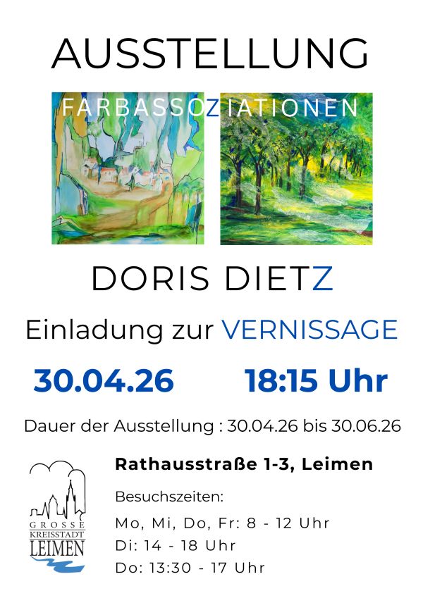(16.4.26 – np) Am Donnerstag, dem 30. April 2026, präsentiert die Leimener Künstlerin Doris Dietz im Neuen Verwaltungsgebäude der Stadt Leimen (Rathausstraße 1-3) ihre retrospektive Ausstellung „Farbassoziationen“. Die Vernissage beginnt um 18:15 Uhr und bietet Besuchern die Gelegenheit, die Künstlerin persönlich kennenzulernen sowie einen Einblick in ihr vielseitiges Werk zu gewinnen.