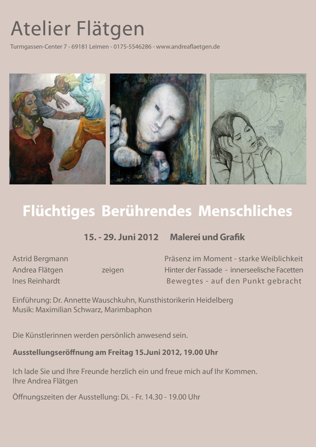 Die Ausstellung „Flüchtiges Berührendes Menschliches“ mit Malerei und Grafik findet vom  15. Juni 2012 bis 29. Juni 2012 im Atelier Flätgen in Leimen statt. Es werden Arbeiten von Astrid Bergmann, Andrea Flätgen und Ines Reinhardt gezeigt. Ausstellungseröffnung ist  am Freitag 15. Juni 2012, 19.00 Uhr. Die Künstlerinnen werden anwesend sein.