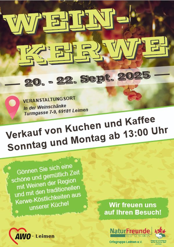 Denn genau dann, zur Weinkerwe vom 20. bis 22. September, wird die Begegnungsstätte zum Weindorf – liebevoll hergerichtet, mit Leckereien und edlen Tropfen aus der Region. Die AWO Leimen verwandelt ihr Haus in ein gastfreundliches Festlokal. Kaffee und Kuchen ab 13 Uhr, sonntags und montags, wie früher bei Tante Leni – nur diesmal mit Musik und einem Hauch Festtagsglanz.