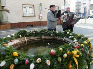 Die Aktion hat in Leimen bereits eine lange Tradition: Seit 2014 wird der Bärenbrunnen alljährlich von den Landfrauen österlich dekoriert. Lediglich im Corona-Jahr 2020 musste die beliebte Tradition pausieren. Unter der Leitung von Renate Müller, der Ersten Vorsitzenden der Leimener Landfrauen, wurde auch in diesem Jahr wieder mit großem Engagement und viel Liebe zum Detail gearbeitet.