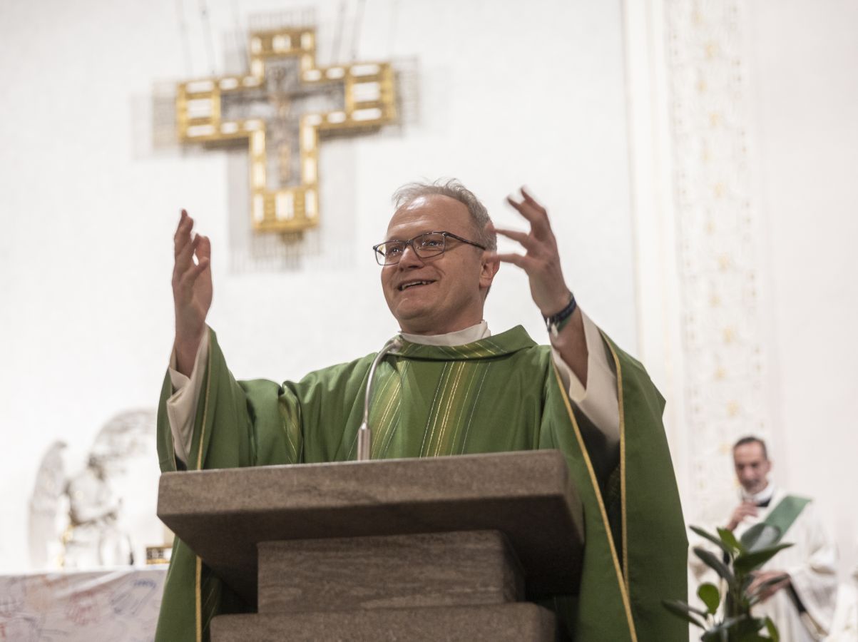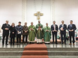 Pfarrer Pawelzik gab dann vor der versammelten Kirchengemeinde sein Investiturversprechen ab. Dann segnete Gompper ihn zusammen mit seinen engsten Kollegen – d.s. Georg Henn (stellvertretender Pfarrer), Gernot Hödl (leitender Referent) sowie Heiko Wenz (Pfarreiökonom) und sein Stellvertreter Nicolas Kneis. Er forderte sie auf, zusammen ihren Glauben zu bekennen – ein besonders starker Moment gleich zu Beginn, als die versammelte Gemeinde sich spontan erhob und das Glaubensbekenntnis kräftig mitsprach. Als Zeichen der Verbundenheit mit der Erzdiözese Freiburg überreichte Thorsten Gompper ein Glasbild der Schutzmantelmadonna aus dem Freiburger Münster.