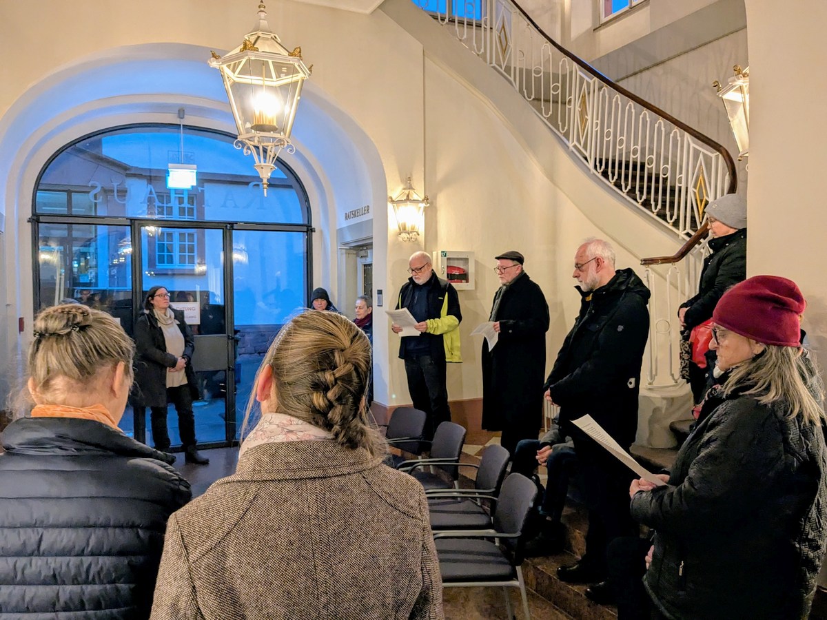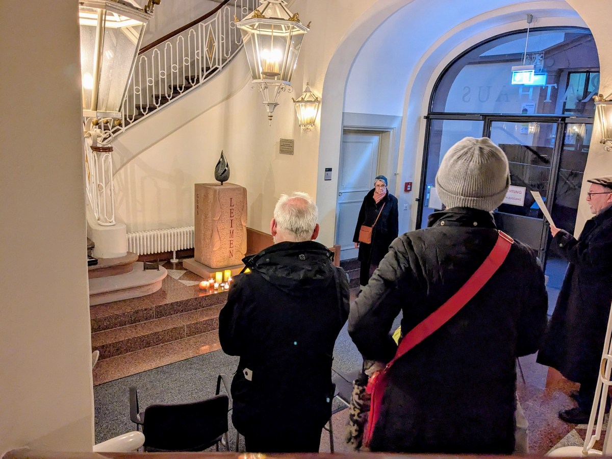 (pm – 10.11.25) Ca. 20 Menschen versammelten sich am frühen Sonntagabend zu einer Gedenkveranstaltung anlässlich des 9. November am Gurs-Mahnmal im Historischen Rathaus.