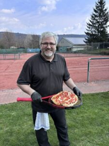 Richard Gerlich hatte kurzerhand seinen Gasgrill auf der Birkenwiese aufgebaut, aber nicht um die typischen Grillwürste oder Grillsteaks zu brutzeln, sondern um zu zeigen, dass mit Grill und Pizzastein auch hervorragende Pizzen zubereitet werden können. Alle waren sich am Ende einig, dass die italienische Pizza der spanischen Paella in nichts nachstand, wobei die Pizza beim Servieren auf einem Tennisschläger mit einem klaren Zweisatz-Sieg punktet.