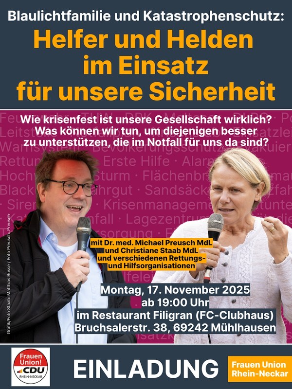 Die Frauen Union Rhein-Neckar lädt am Montag, 17. November 2025, um 19:00 Uhr, zu einer öffentlichen Veranstaltung unter dem Titel „Blaulichtfamilie und Katastrophenschutz: Helfer und Helden im Einsatz für unsere Sicherheit“ ein. Tagungsort ist das Restaurant Filigran (FC-Clubhaus, Bruchsaler Straße 38, 69242 Mühlhausen).