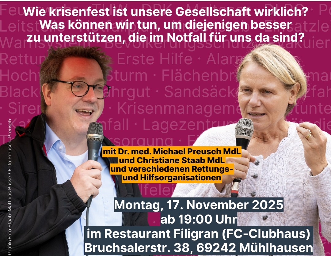 Gäste des Abends sind die beiden Landtagsabgeordneten Christiane Staab (CDU) und Dr. Michael Preusch (CDU), die in der Enquetekommission „Krisenfeste Gesellschaft“ des Landtags Baden-Württemberg an tragfähigen Empfehlungen für mehr Sicherheit, Vorsorge und gesellschaftlichen Zusammenhalt mitgewirkt haben. Beide Parlamentarier möchten Einblicke in die Arbeit der Kommission und die zentralen politischen Handlungsschwerpunkte geben.