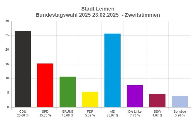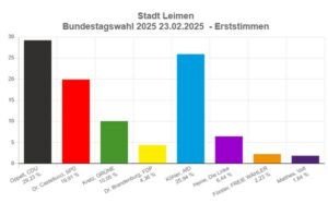 Insgesamt konnte sich bei den Erststimmen in ganz Leimen Moritz Oppelt (CDU) mit 29.23% recht knapp gegen Horst Köhler (AFD, 25,94%) durchsetzen. Er erreichte im Wahlkreis 277 (Rhein-Neckar) als Direktkandidat mehr Stimmen (34,42%) als seine Partei, die bei den Zweitstimmen auf 31,09 % kam.