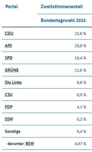 Allerdings reicht dieses Ergebnis nicht, um erneut in den Bundestag einzuziehen! Zu den Gründen, siehe hier.