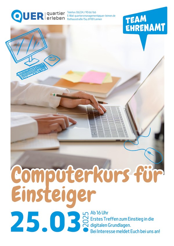 (fwu – 28.2.25) Der Umgang mit dem Computer ist heute in vielen Bereichen des Alltags unverzichtbar. Um den Einstieg zu erleichtern, bietet das QUER in Leimen einen Computerkurs für Einsteiger an. Bevor die praktischen Einheiten beginnen, findet