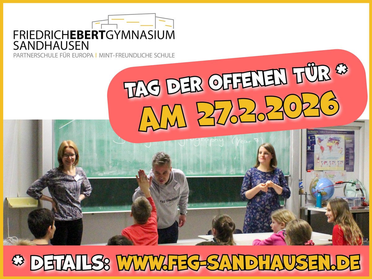(jw – 12.2.26) Alljährlich zu Beginn des 2. Halbjahres stellt sich das Friedrich-Ebert-Gymnasium den künftigen Fünftklässlerinnen bzw. Fünftklässlern und deren Eltern beim „Tag der offenen Tür“ vor. Am Freitag, den 27.2.2026 ist es wieder so weit: Zwischen 16:30 und 19:30 Uhr präsentiert sich die Schule von ihrer besten Seite.