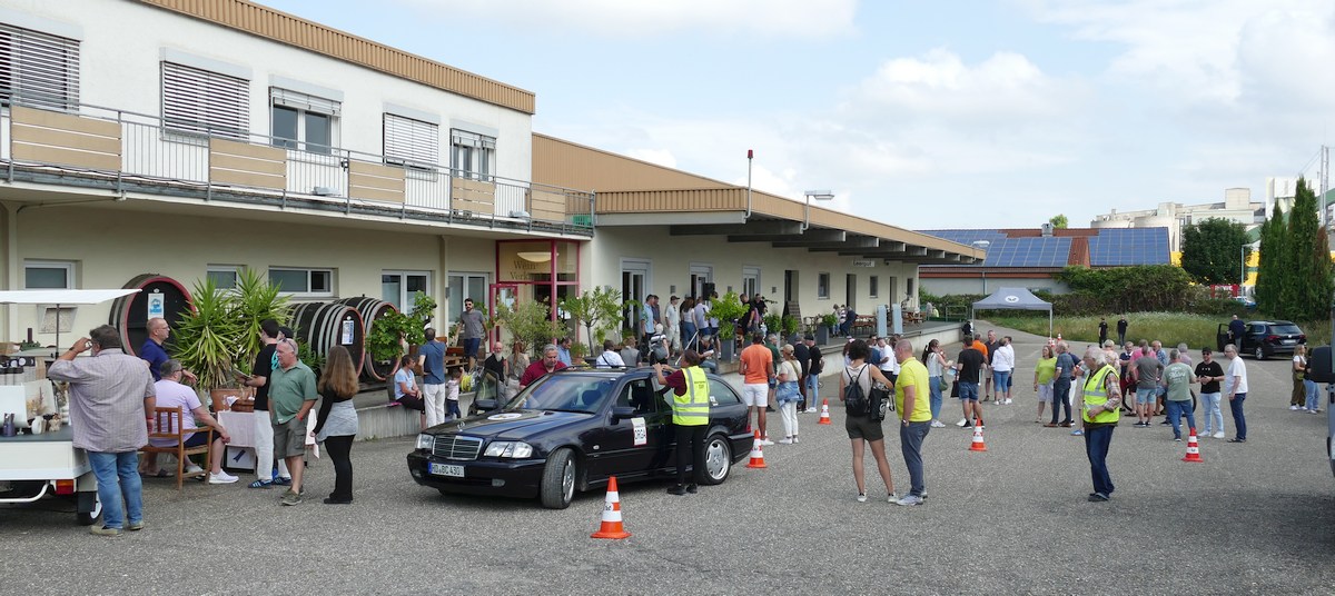 Hier auf dem Parkplatz vor dem Weingut fand auch die erste Wertungsprüfung für die Rallye-Teilnehmer mit ihren Fahrzeugen statt. Weitere Prüfungen erfolgten dann bei den nächsten Stops.