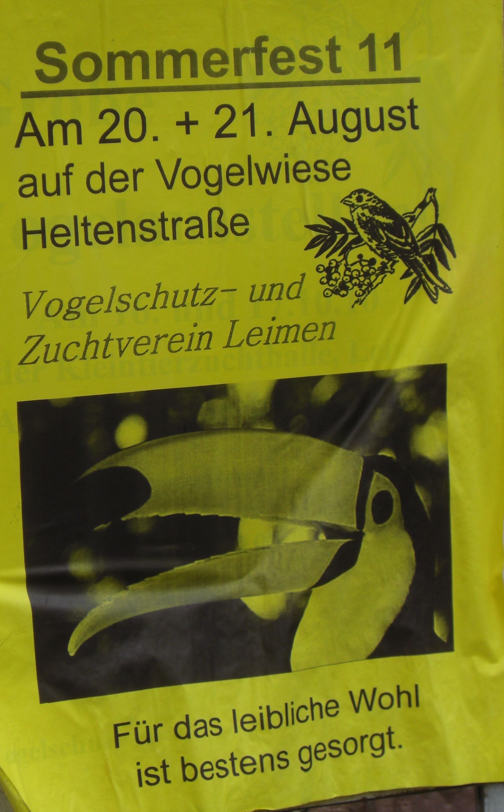 Es sei denn, Sie wollen Samstag/Sonntag auf das plakatierte Sommerfest des „Vogelschutz- u. Zuchtverein 1964 Leimen e.V., Vereinsgelände / Heltenstraße in Leimen“ gehen. Das wäre vielleicht auch einen eigenen Bericht wert: diese Veranstaltung ist nämlich wirklich geheimnis umwittert. Bislang gelang weder, einen Verantwortlichen des Vereins zu erreichen, noch in oder an der Heltenstraße eine „Vogelwiese“ zu entdecken. Auch einige befragte Anwohner konnten nicht helfen. Es bleibt uns (und ggf. Ihnen) also nichts anderes übrig, als dem Krähen der ausgestellten Hähne zu folgen, um die Veranstaltung zu finden.