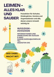 (sda – 29.1.26) Unter dem wiederkehrenden Motto „Leimen – alles klar und sauber“ möchten wir auch dieses Jahr wieder unsere Stadt fit fürs Frühjahr machen. Wir wollen an die Erfolge der letzten Jahre anknüpfen und wünschen uns, dass sich wieder viele Vereine, Schulen, Kindergärten, Organisationen und Familien an dieser Aktion beteiligen.