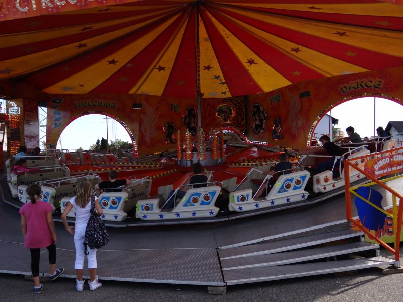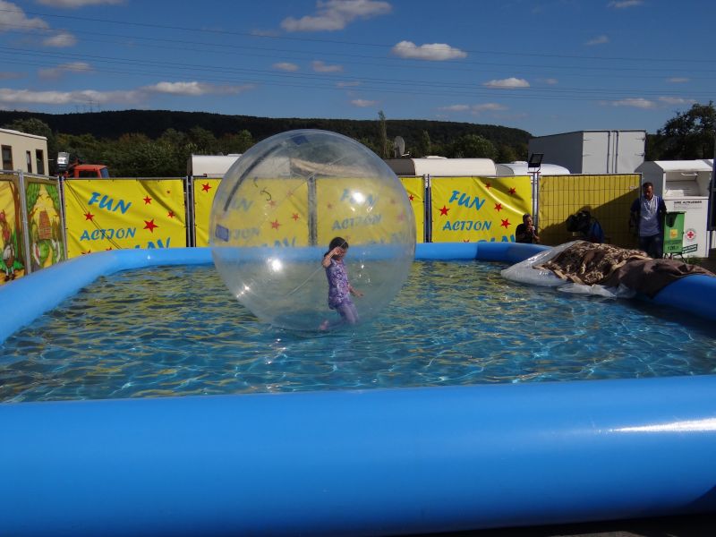 Gemächlicher geht´s beim Kettenkarussel und den „Selbstfahrern“ zu und ein besonderes Vergnügen ist es, in einer „Seifenblase“ durch und über den  Wasserpool zu laufen/ kriechen/ fallen.