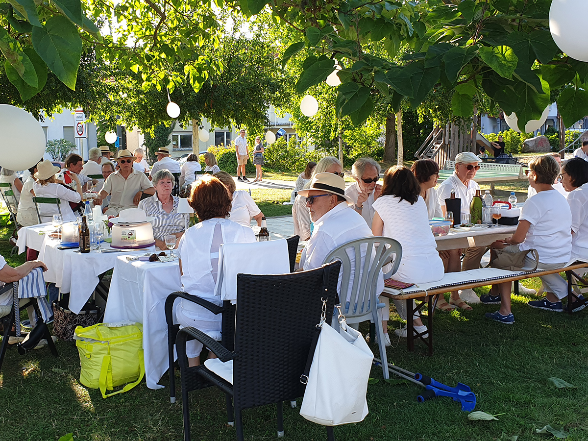 Bei sonnigem Wetter zog es viele Besucherinnen und Besucher in den Schatten der Bäume, wo sie sich mit mitgebrachten Leckereien eine entspannte Auszeit gönnten. Ganz im Sinne des Konzepts kamen viele Gäste in weißer Kleidung und teilten Speisen, Getränke und gute Gespräche in geselliger Atmosphäre.