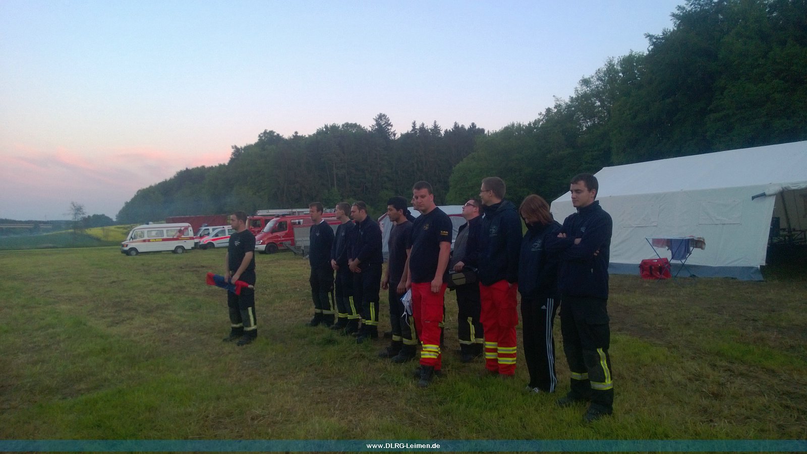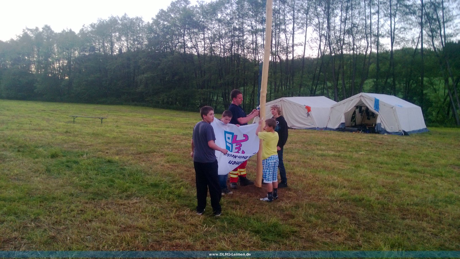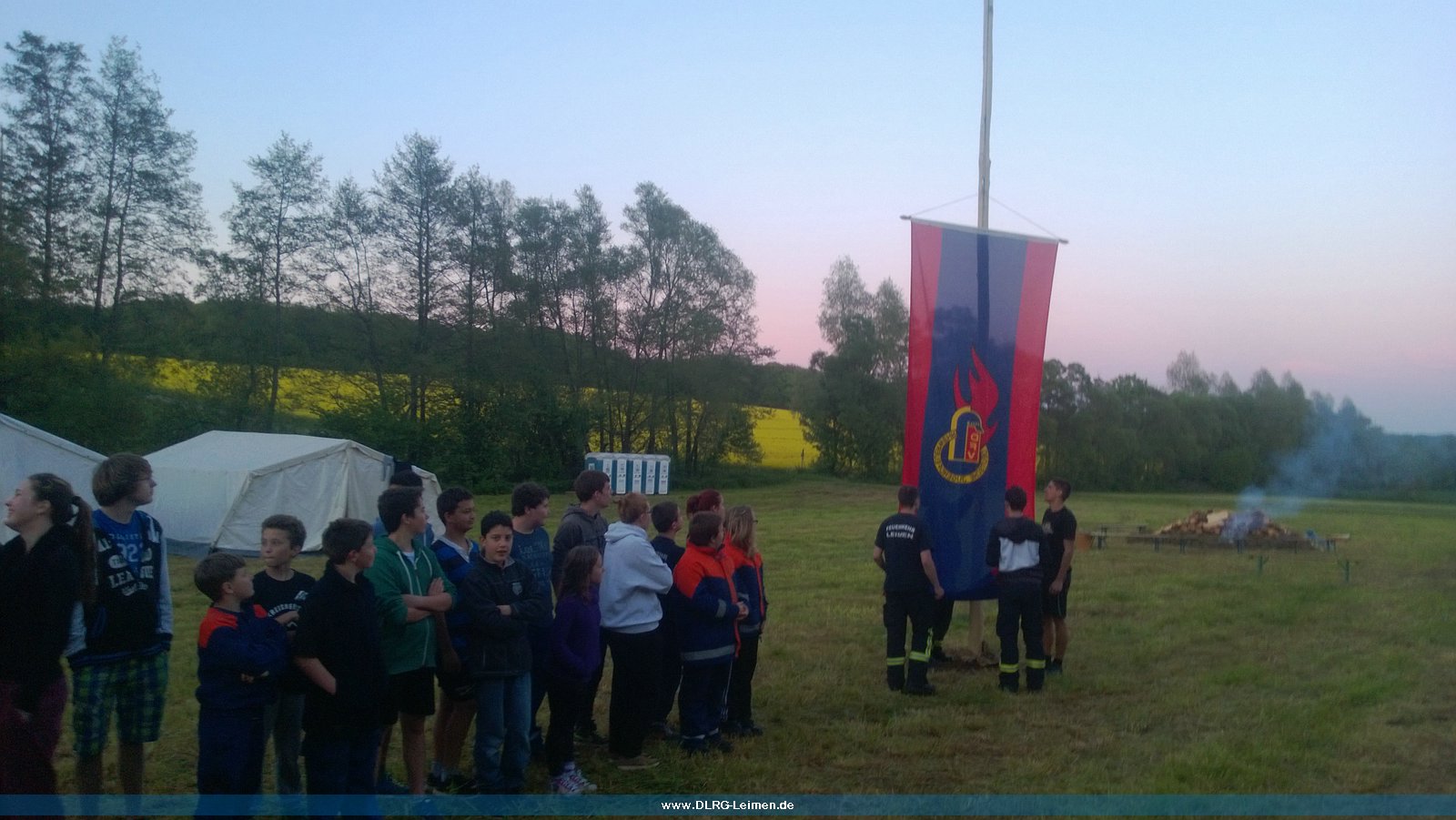 Nach ca. 1 ½ Stunden Fahrt kamen wir dann mit den Jugendlichen im Lager an. Aber anstatt sich dort erst mal gemütlich nieder zu lassen, hieß es sofort für die Jugendlichen angetreten und Zelte aufbauen! Nach kurzer Anleitung standen die Zelte der Jugendlichen auch relativ schnell und diese konnten ihre Schlafplätze einrichten. Zudem wurden die Fahnenmasten aufgestellt und das erste Mal die Flaggen gehisst. Nach dem Abendessen wurden diese wieder eingeholt und es ging zum gemütlichen Teil des Tages über: gemeinsames Singen am Lagerfeuer. Zugegeben das Singen war recht verhalten, aber doch noch leicht zu hören.