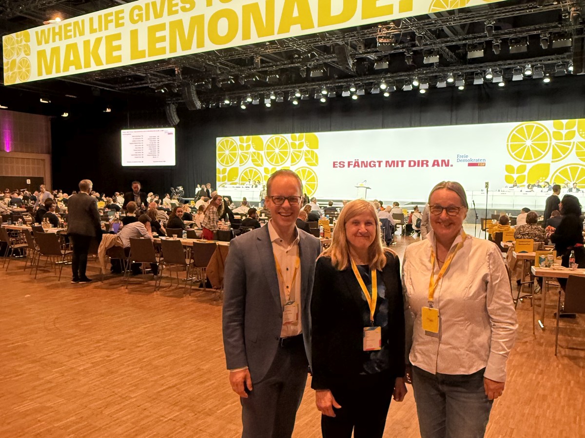 Das Team der FDP Rhein-Neckar auf dem Bundesparteitag: Jens Brandenburg, Claudia Felden und Ulrike von Eicke (v.l.n.r.).