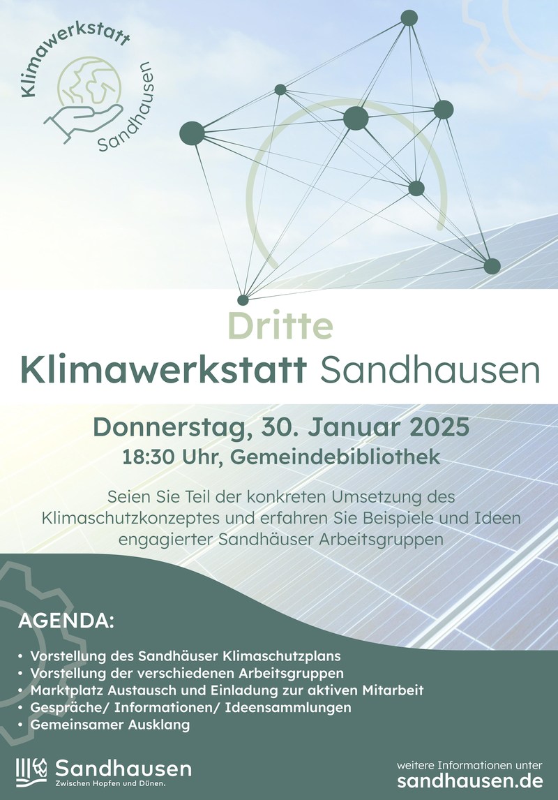 Krause selbst wird an diesem Abend das Klimaschutzkonzept der Hopfengemeinde kurz skizzieren, das unter anderem einen Katalog mit 40 Maßnahmen in zehn Bereichen vorhält. Außerdem werden sich die Arbeitsgruppen vorstellen. Das sind die Gruppen Energie, Repaircafé, Hofflohmarkt, In der Stadt, Climate Fresk und Suppentopf. Die Gruppe Energie besitzt beispielsweise viel Expertise in Energiethemen und möchte für Sandhäuserinnen und Sandhäuser hierzu Beratung anbieten, während ihre Kolleginnen und Kollegen der Repaircafé-Gruppe vom Wegwerfen wenig halten und vielmehr Fahrräder, Elektrogeräte, Kleinmöbel oder Bekleidung wieder auf Vordermann bringen.