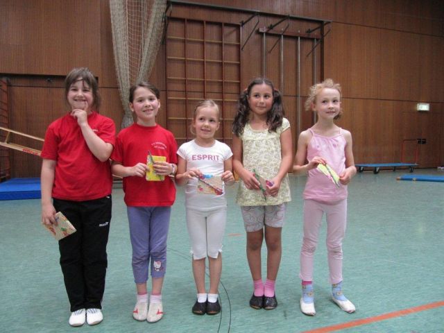 Zum Schluss wurden noch die fleißigsten Turnerinnen mit einer kleinen Überraschung geehrt. Laura Müller fehlte nur 1 Mal im zurückliegendem Halbjahr, Paula Kettenmann, Evrim Isikürek, Silia Oswald und Leonie Theil fehlten nur 2 Mal. Eine tolle Leistung! Macht weiter so und besucht fleißig die Turnstunden – es lohnt sich. Wir wünschen allen Kindern tolle erholsame Ferien und wir sehen uns wieder am Freitag, 23.09.2011, beim Turnen.