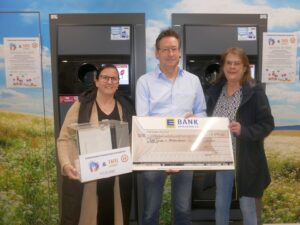 Herz zeigen mit einem Klick am Automaten: Stefan Walter übergibt den symbolischen Scheck an Sandra Werner und Sabine Kuhn.