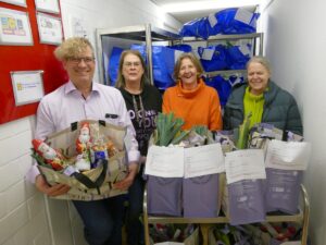 Silke und Armin Hofmann (Mitte) mit Sabine Kuhn von der Tafel Leimen (links) und Birgit Zeitler von der Stadt Leimen (rechts) – zwischen ihnen: Tütenweise Weihnachtsfreude.