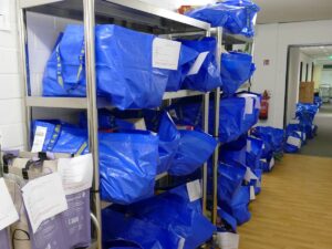 Reihenweise gepackte Taschen: Jede steht für ein Weihnachtsessen – und für Menschen, die nicht vergessen wurden.
