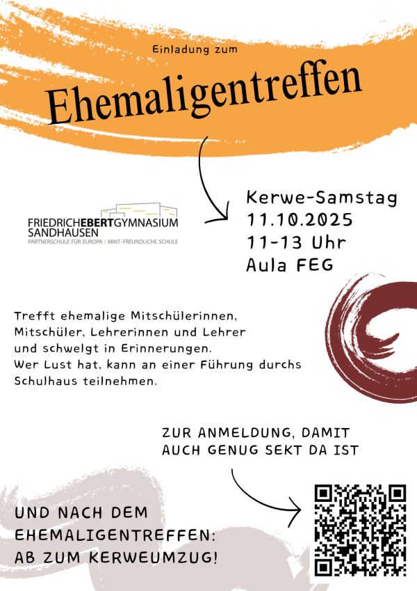 (jw – 27.8.25) Der Elternbeirat lädt Ehemalige des FEGs zu einem Treffen in der Schule ein. Im Vorfeld der Sandhäuser Kerwe wird die Gelegenheit geboten, sich in der Aula der Schule mit Mitschülerinnen und Mitschülern aus der eigenen Stufe, aber auch mit alten Bekannten aus benachbarten Stufen zu treffen.