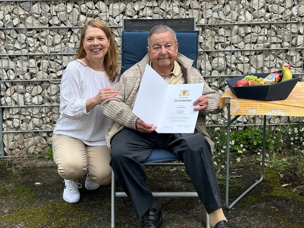 Mit einem einem Lächeln, das Bände spricht, nahm Hugo Knebel die Glückwünsche von Bürgermeister-Stellvertreterin Britta Kettenmann entgegen. Sie überreichte im Namen des Ministerpräsidenten Winfried Kretschmann eine offizielle Urkunde – fein säuberlich gedruckt, mit Landeswappen und allem Drum und Dran. Dazu gab’s ein Präsent von der Stadt Leimen. Ein kleines Zeichen der Anerkennung für ein großes Leben.