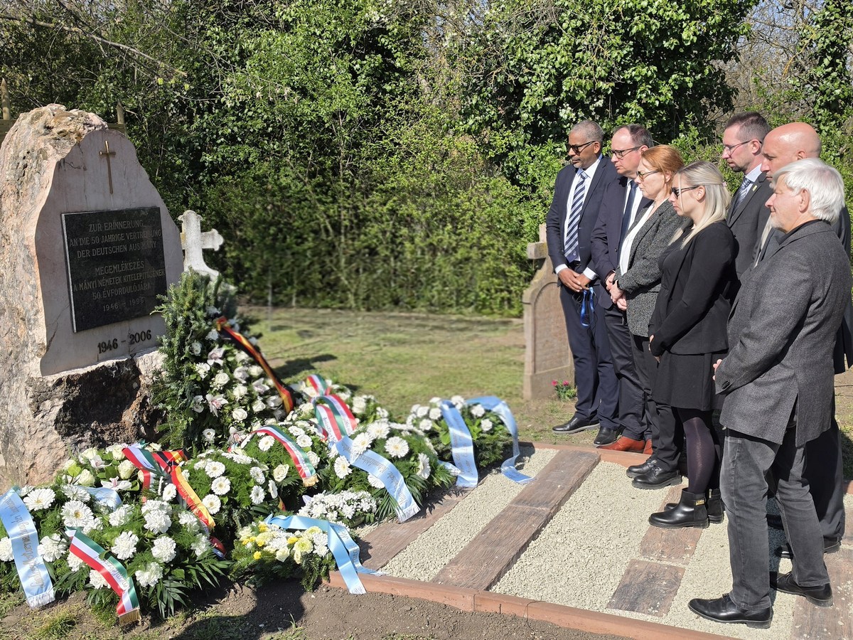 Die Gedenkfeier am Mahnmal unterstrich durch hochrangige Gäste wie Staatssekretär Miklós Soltész, Katalin Pintér-Nagy (Vorsitzende der Nationalitäten-Selbstverwaltung) und Gregor Gallai (Landsmannschaft) die Bedeutung des Tages. Besonders bewegend war der Beitrag des 95-jährigen Zeitzeugen Franz Fuchs: Seine Aufzeichnungen berichteten eindringlich von den Schrecken der Deportation, aber auch vom Mut beim Wiederaufbau. In seiner Rede betonte OB Ehret die tief gewachsenen Wurzeln zwischen Mány und Leimen und auch er unterstrich den Mut und Fleiß der Vertriebenen. Mit dem ungarischen Satz „A múlt emlékezet, a jövő közös utunk“ (Die Vergangenheit ist Erinnerung, die Zukunft unser gemeinsamer Weg) unterstrich er den Willen zur Versöhnung. Alle Redner einte der Appell: Dieses Leid darf sich nie wiederholen; die Freundschaft muss stärker sein als die Schatten der Vergangenheit Den Abschluss bildete ein mobiles Gastspiel der Deutschen Bühne Ungarn (DBU) mit einer intensiven Aufführung über das Schicksal der Ungarndeutschen im Jahr 1948.