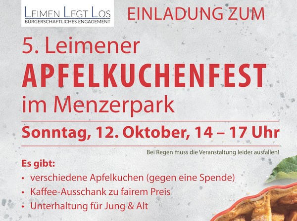 (rng – 9.10.25) Am Sonntag, den 12. Oktober, ist es wieder soweit. Von 14 bis 17 Uhr lädt die bürgerschaftliche Initiative „Leimen Legt Los“ alle Leimener und Leimenerinnen, ihre Familien und Freunde zum Apfelkuchenfest in den Menzerpark ein. Wer einen Teller (und am besten auch eine Gabel) mitbringt, kann sich aus der Auswahl ein Stück Kuchen (oder auch zwei) aussuchen und im Gegenzug eine Spende ins Glas werfen.